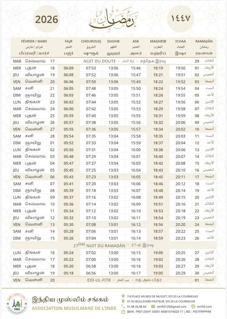 Horaires Salât Ramadan