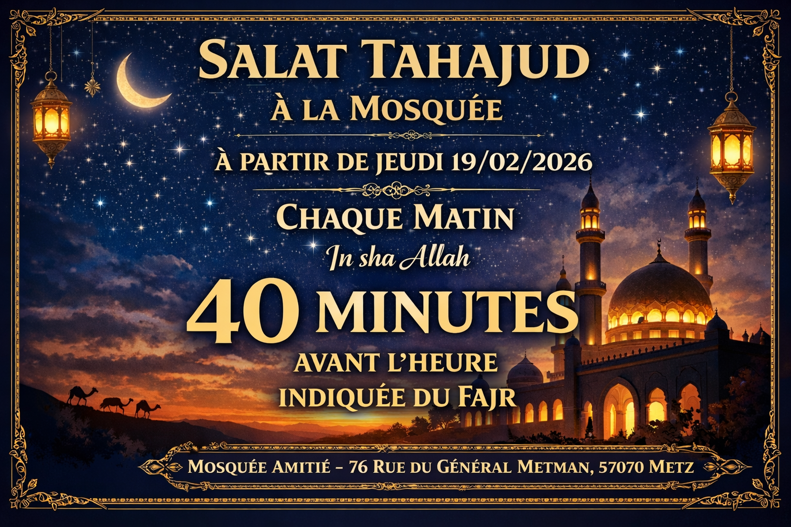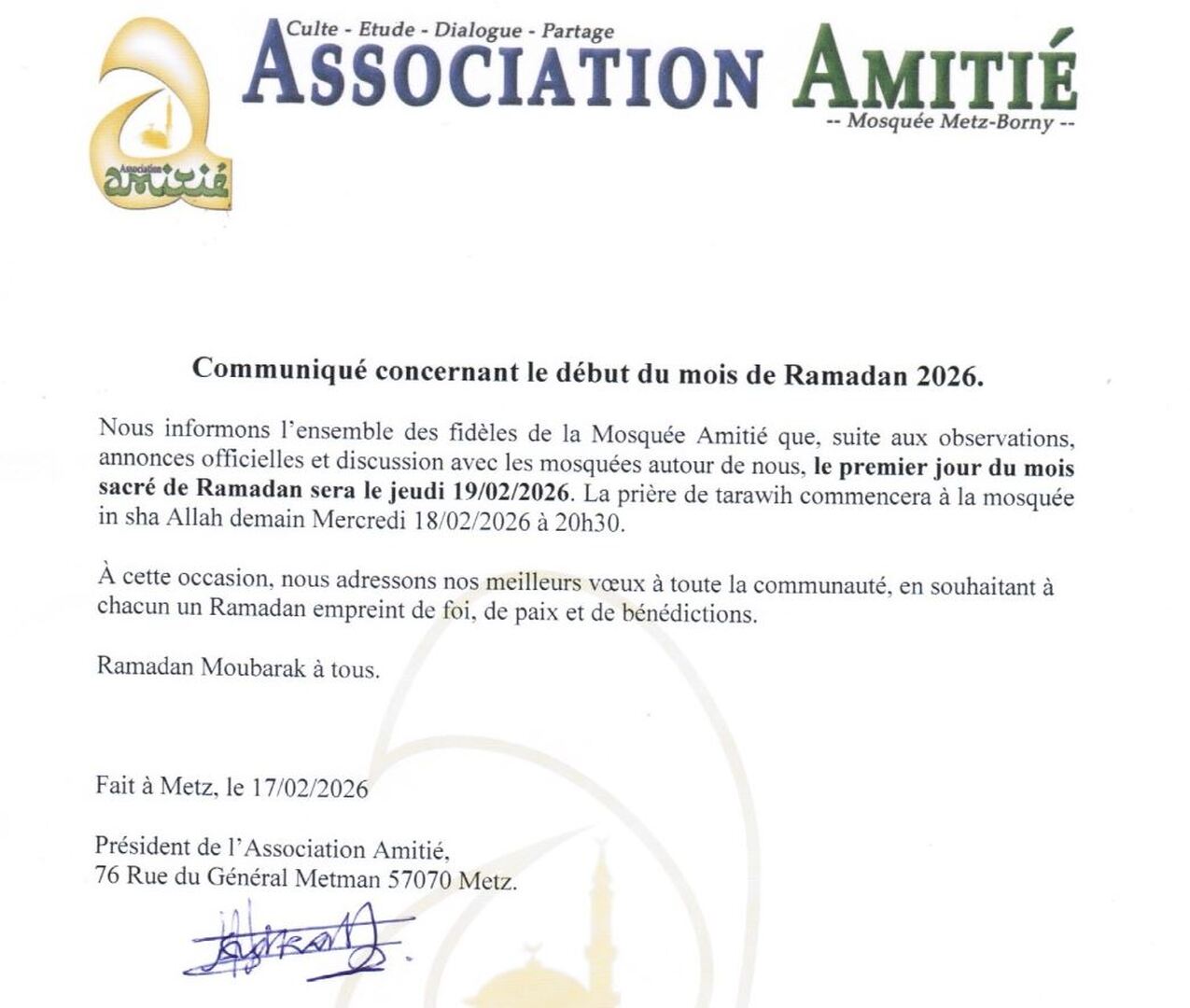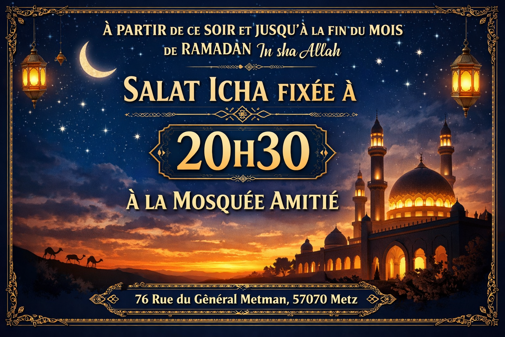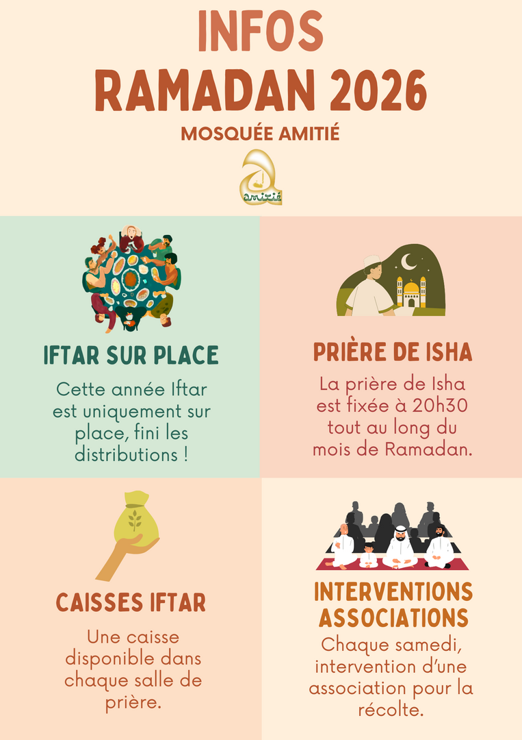 Nous informons l'ensemble des fidèles de la Mosquée que le premier jour du mois sacré de Ramadan sera in sha Allah le jeudi 19/02/2026. Salat Icha est fixé à compter de ce soir à 20h30 à la Mosquée.