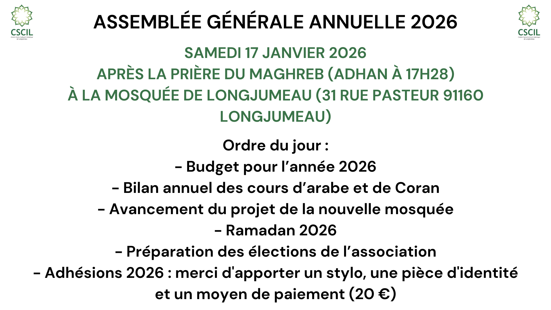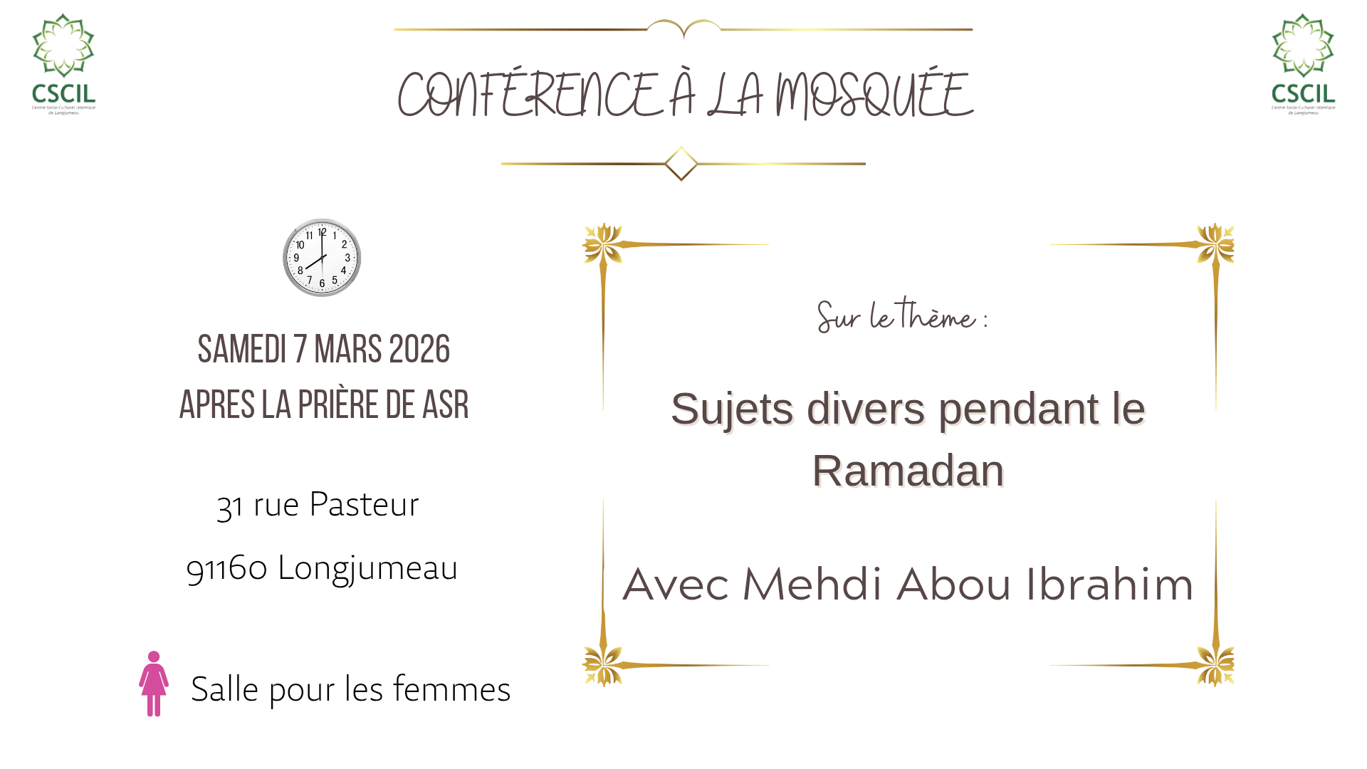 En raison du manque de place, la prière du vendredi se fait à la salle Anne Frank, située à l'adresse 5 rue Daniel Mayer 91160 Longjumeau, à 13h15.