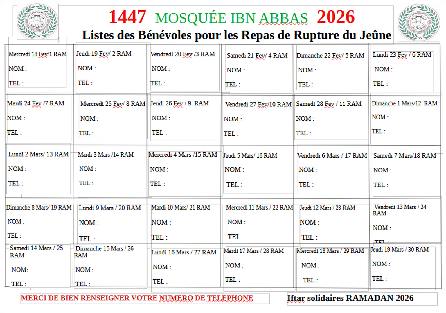 Horaires d'ouverture de la mosquée: 15 minutes avant l'adhan