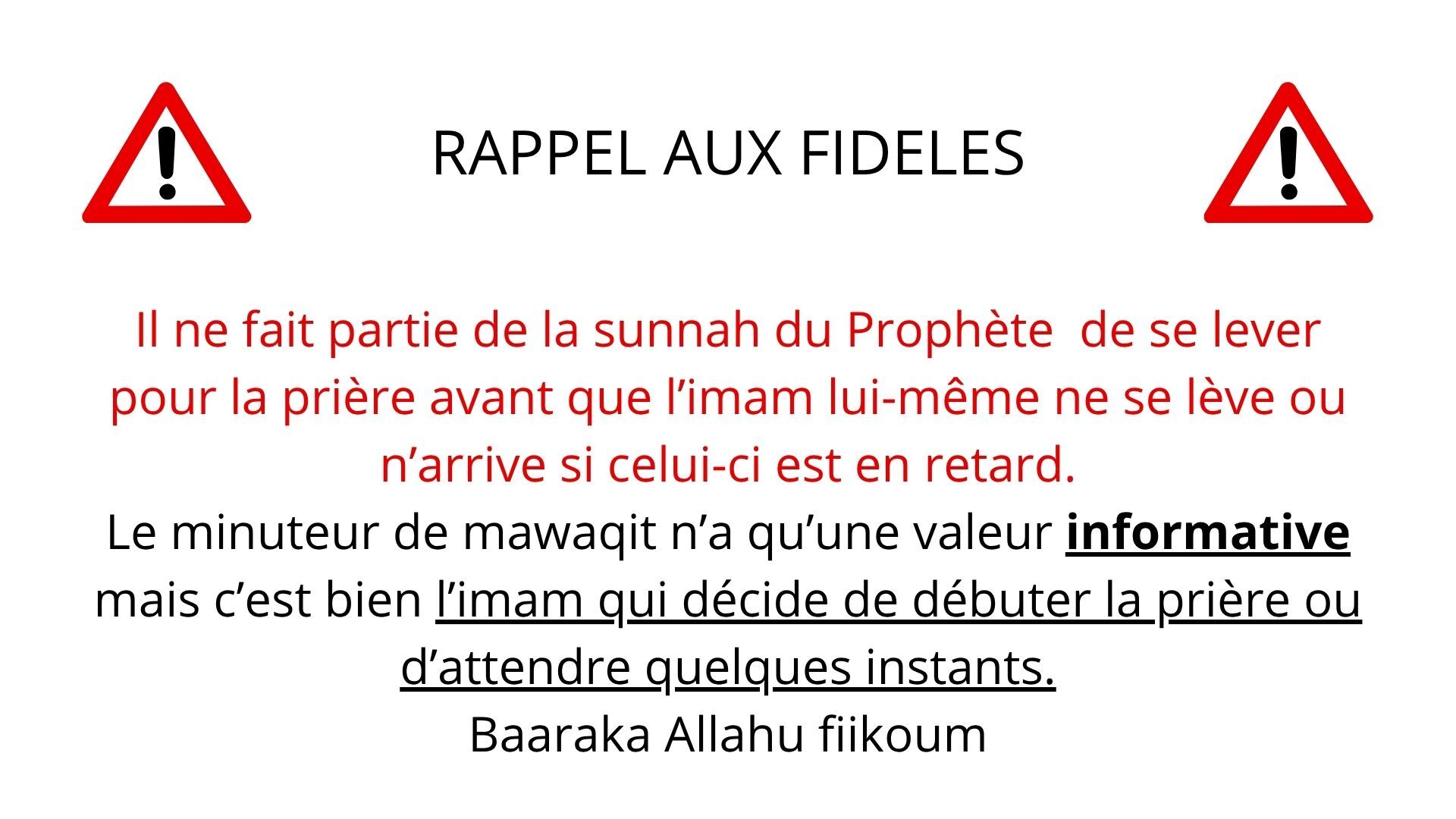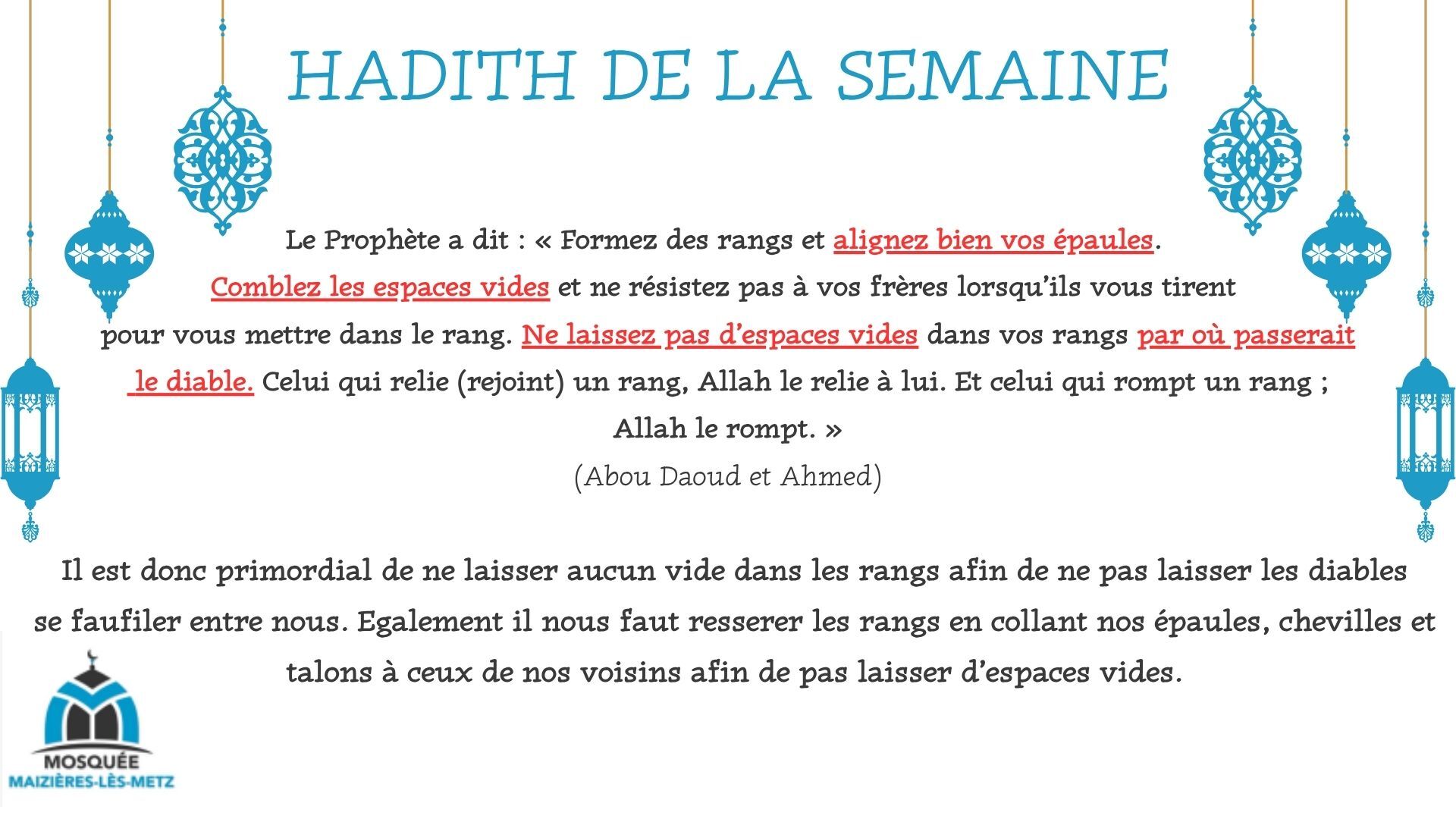 Ô Allah, Maître de cet appel parfait et de la prière que l'on va accomplir, donne à Mohammed le pouvoir d'intercéder (le Jour du Jugement) et la place d'honneur [au Paradis], et ressuscite-le dans la position louable que Tu lui as promise