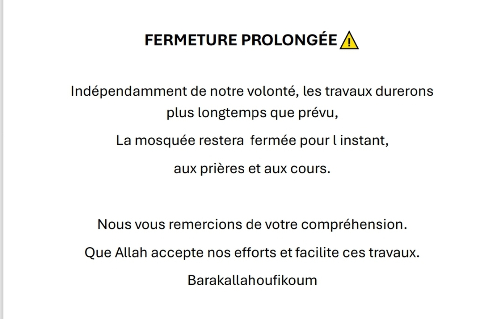 Il est strictement interdit de stationner devant la mosquée.( places limitées pour joumou3aa,sur réservation).