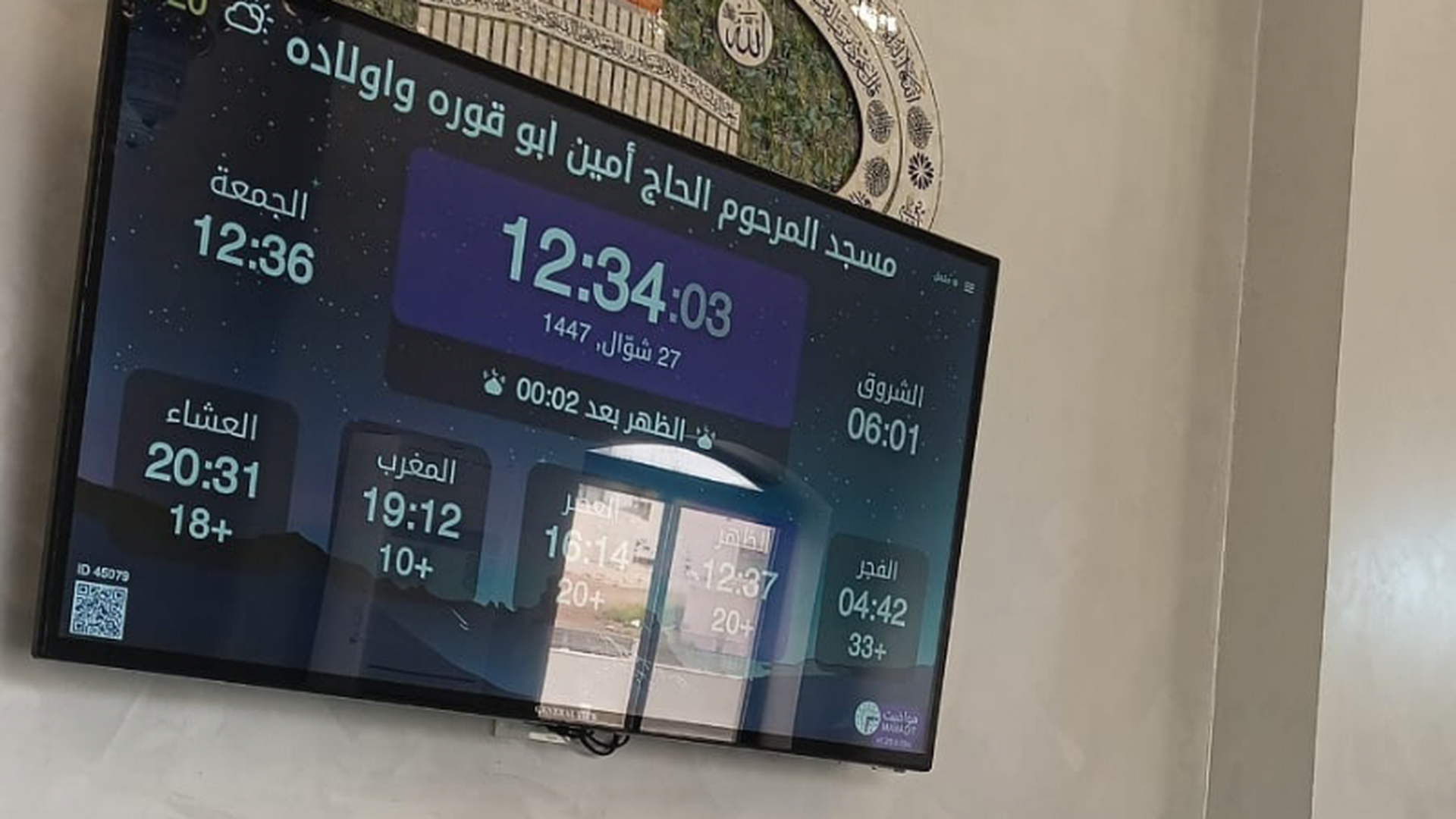 Between the athan and the iqama, and after each prayer, reminders and invocations are displayed. A Prophet's Hadith "May Allah's Prayer and Salvation Be to Him" is also displayed every 5 min
