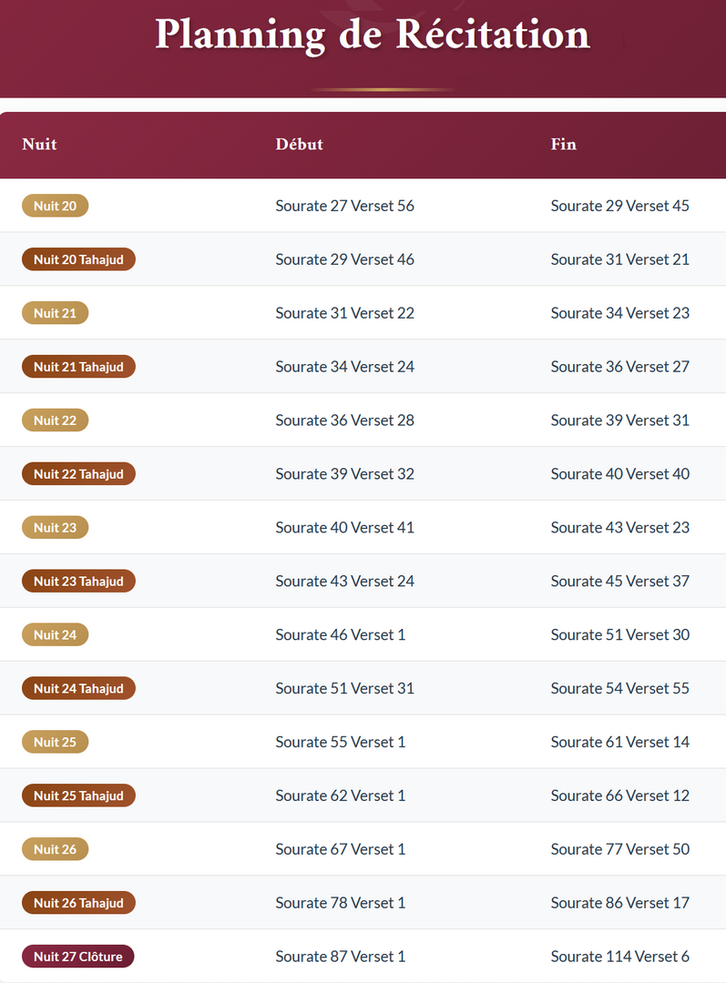 Veuillez trouver sur ce site la planification de récitation du Coran pour chaque nuit de Ramadan : https://programme-ramadan-versailles.vercel.app