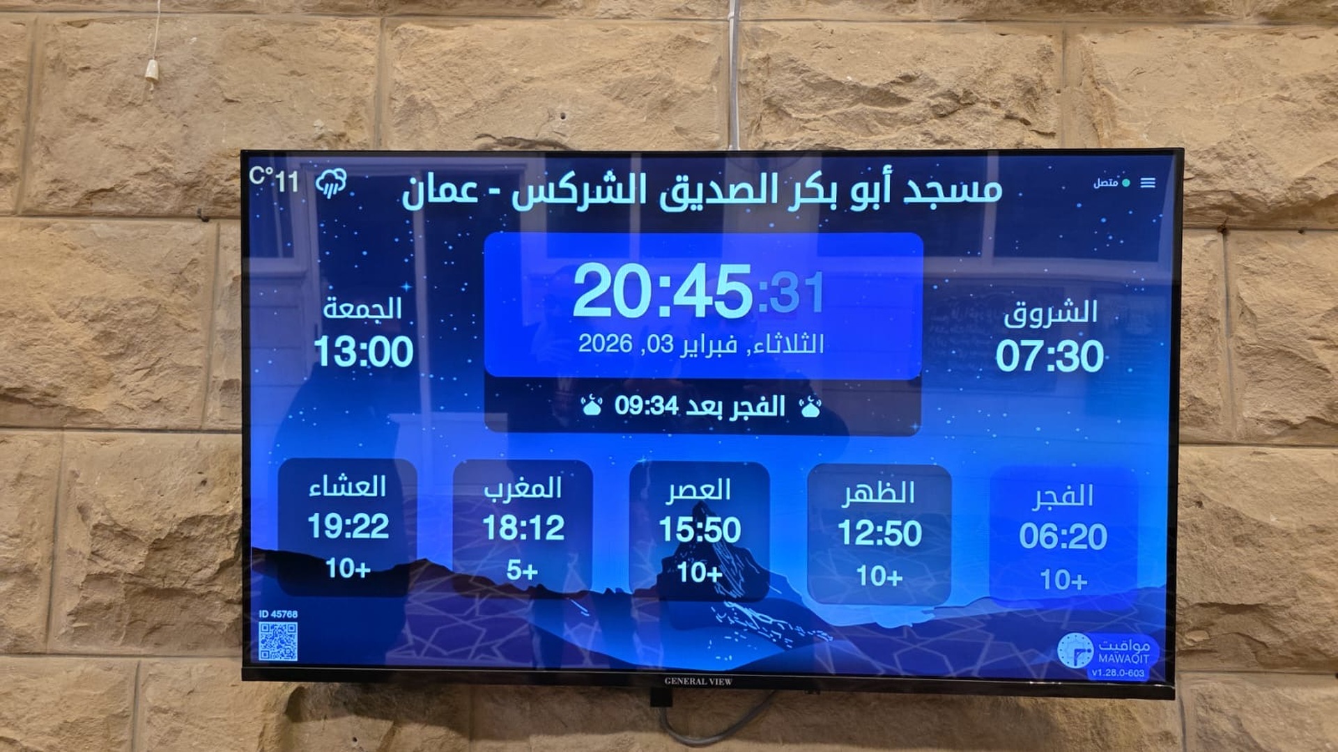 Between the athan and the iqama, and after each prayer, reminders and invocations are displayed. A Prophet's Hadith "May Allah's Prayer and Salvation Be to Him" is also displayed every 5 min