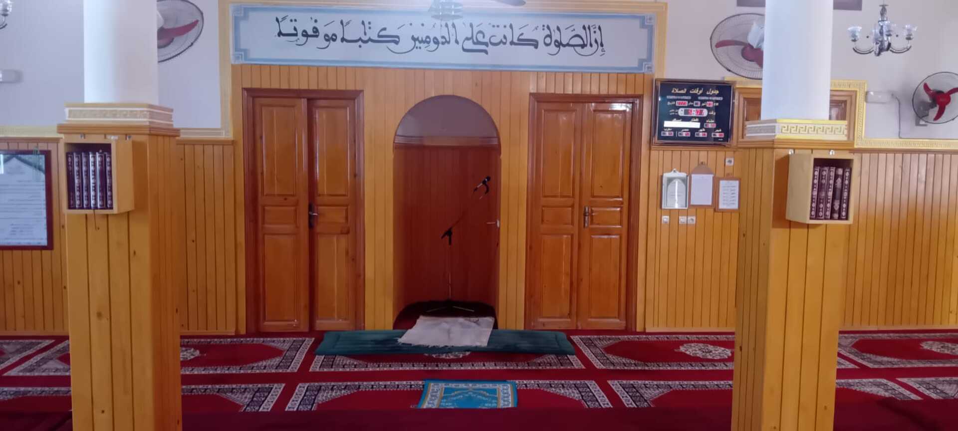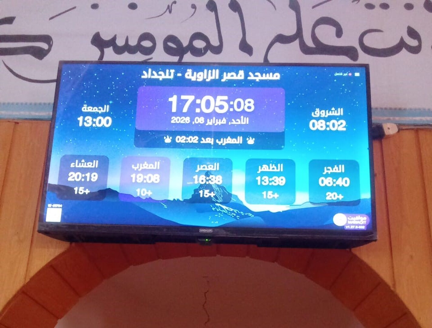 Between the athan and the iqama, and after each prayer, reminders and invocations are displayed. A Prophet's Hadith "May Allah's Prayer and Salvation Be to Him" is also displayed every 5 min