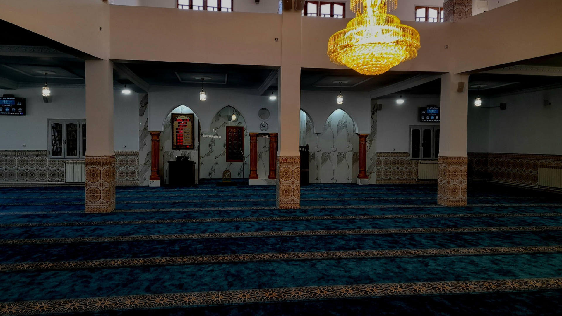 Between the athan and the iqama, and after each prayer, reminders and invocations are displayed. A Prophet's Hadith "May Allah's Prayer and Salvation Be to Him" is also displayed every 5 min