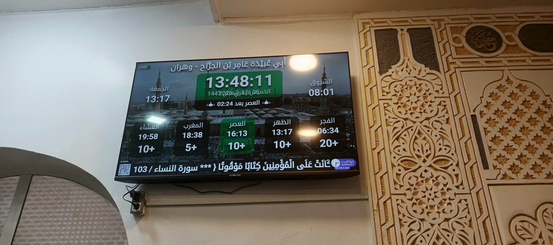 Between the athan and the iqama, and after each prayer, reminders and invocations are displayed. A Prophet's Hadith "May Allah's Prayer and Salvation Be to Him" is also displayed every 5 min