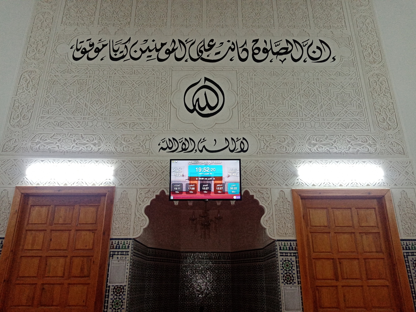 Between the athan and the iqama, and after each prayer, reminders and invocations are displayed. A Prophet's Hadith "May Allah's Prayer and Salvation Be to Him" is also displayed every 5 min