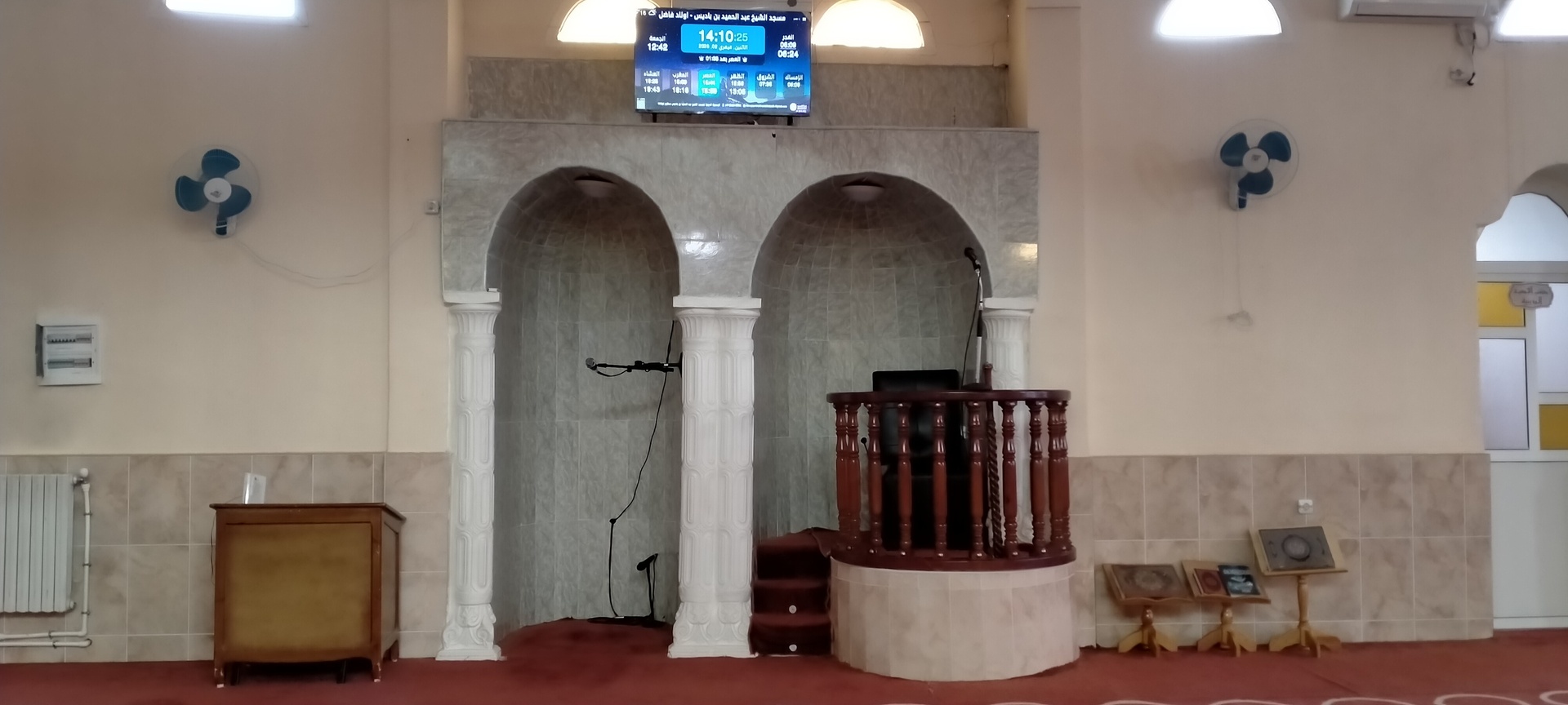 Between the athan and the iqama, and after each prayer, reminders and invocations are displayed. A Prophet's Hadith "May Allah's Prayer and Salvation Be to Him" is also displayed every 5 min