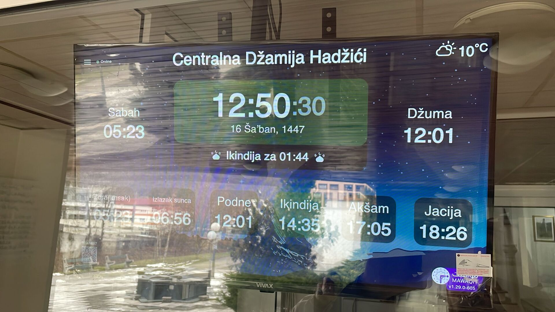 Between the athan and the iqama, and after each prayer, reminders and invocations are displayed. A Prophet's Hadith "May Allah's Prayer and Salvation Be to Him" is also displayed every 5 min
