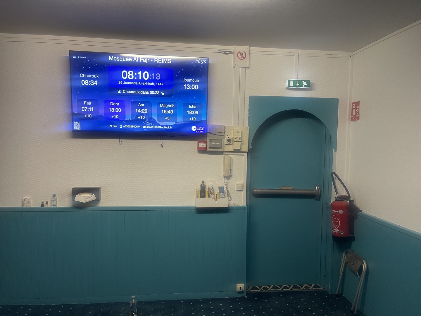 Between the athan and the iqama, and after each prayer, reminders and invocations are displayed. A Prophet's Hadith "May Allah's Prayer and Salvation Be to Him" is also displayed every 5 min