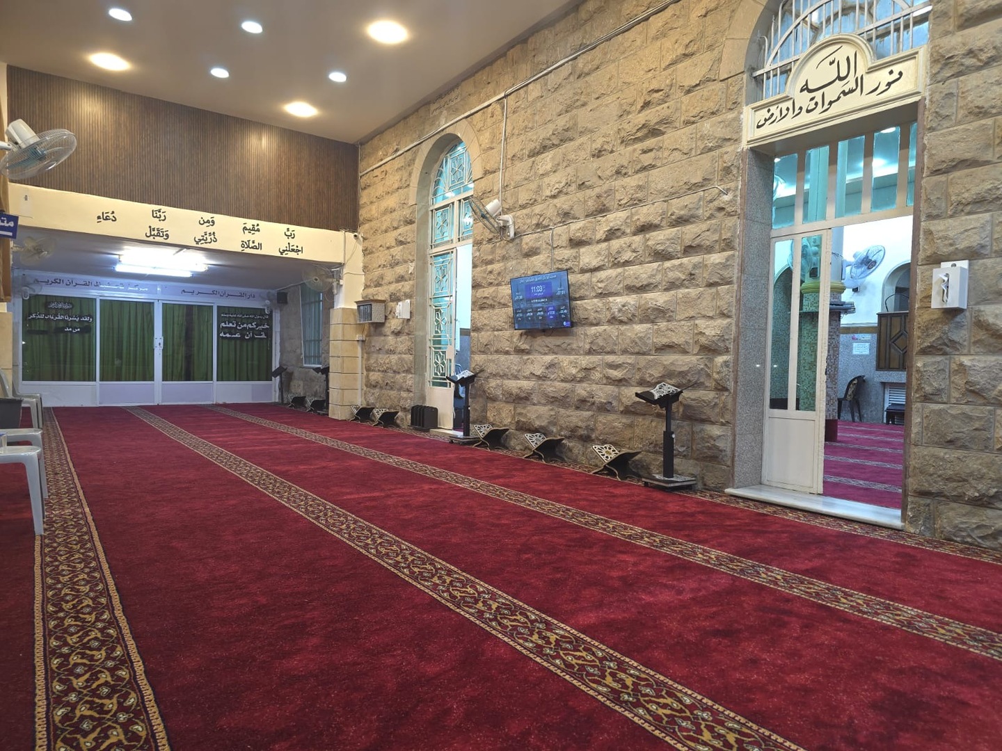 Between the athan and the iqama, and after each prayer, reminders and invocations are displayed. A Prophet's Hadith "May Allah's Prayer and Salvation Be to Him" is also displayed every 5 min