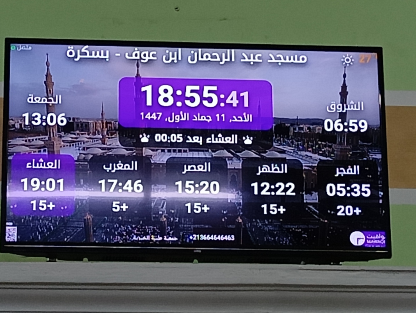 Between the athan and the iqama, and after each prayer, reminders and invocations are displayed. A Prophet's Hadith "May Allah's Prayer and Salvation Be to Him" is also displayed every 5 min