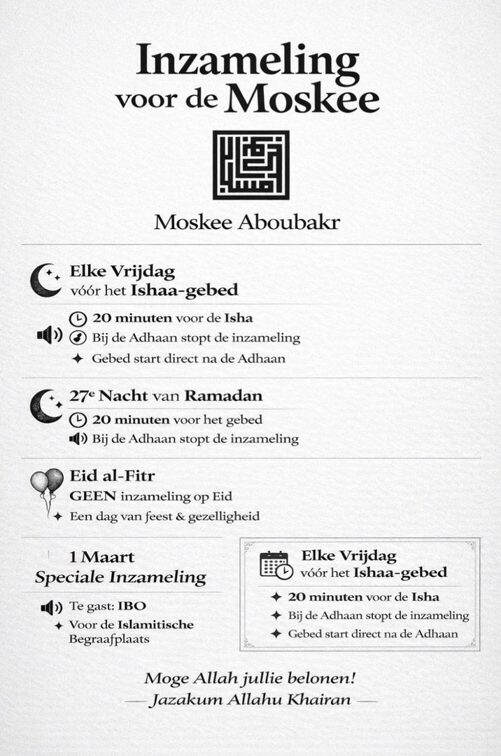 Blijf op de hoogte van de laatste ontwikkelingen en updates met betrekking tot lezingen, vrijdagpreken, nieuwbouwontwikkelingen en vele andere zaken via het Aboubakr Whatsapp-kanaal.