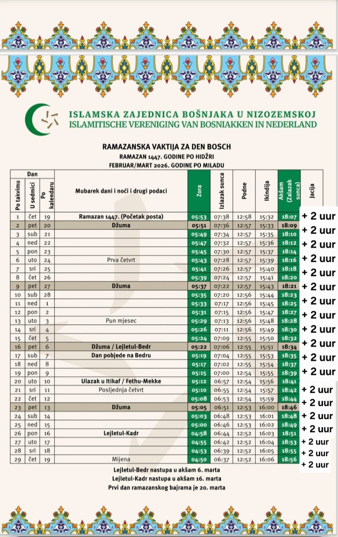 Ishaa & Terawih (20 rekaat) word 2 uur na Maghrib gebeden. Jacija i Teravija (20 Rekata) se klanja 2 sata nakon Akšama. Isha & Terawih (20 Rekat) is prayed 2 hours after Maghrib.