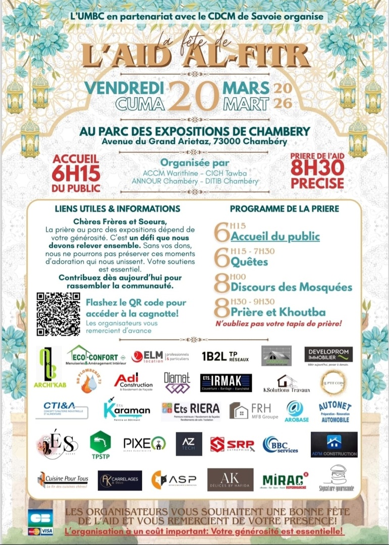 La prière de 'Aïd Al Fitr aura lieu Vendredi 20 Mars 2026 à 8h30 précise au Parc des Expositions de Chambéry incha Allah.