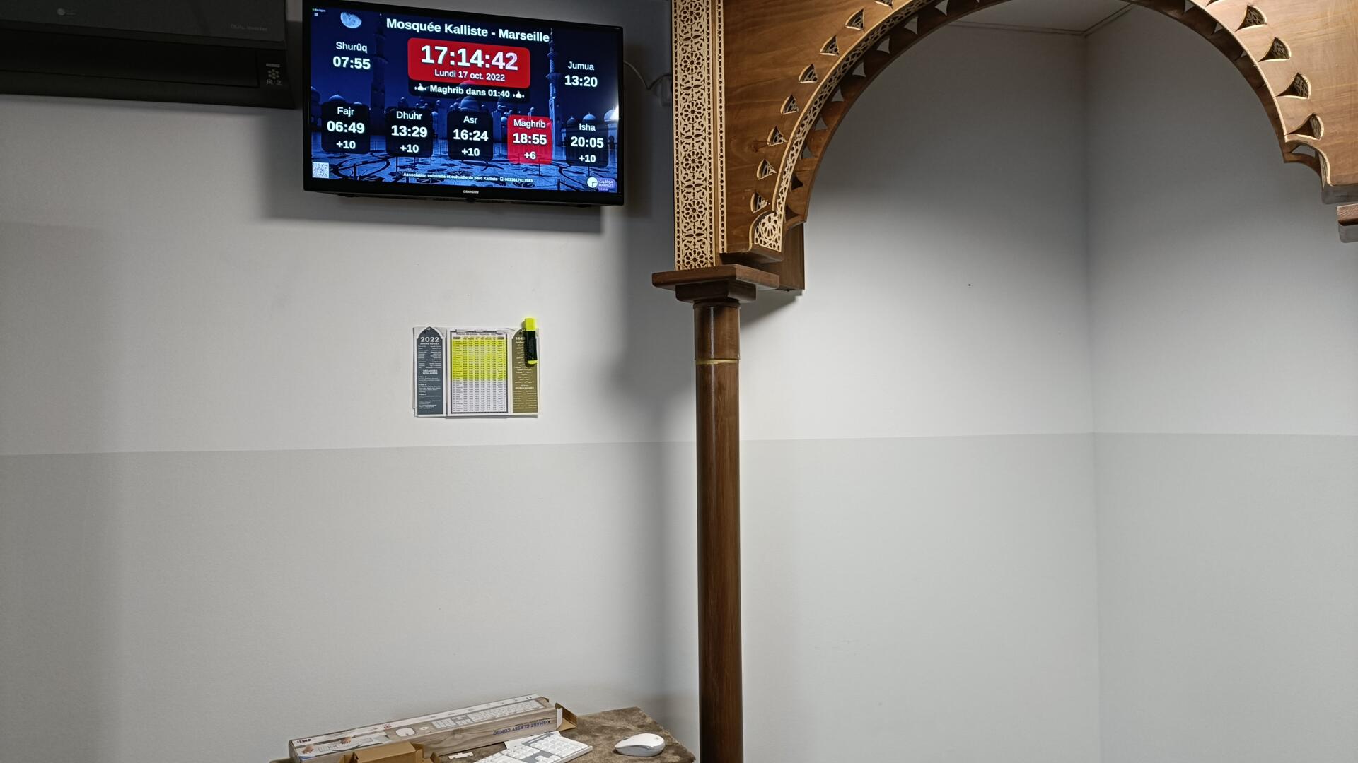 Between the athan and the iqama, and after each prayer, reminders and invocations are displayed. A Prophet's Hadith "May Allah's Prayer and Salvation Be to Him" is also displayed every 5 min