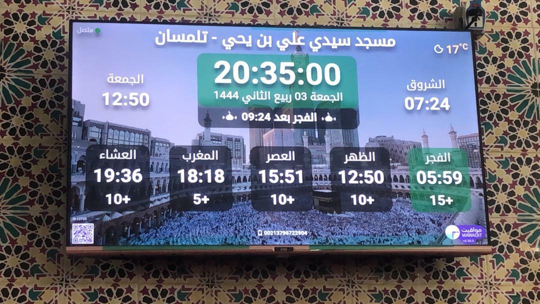 Between the athan and the iqama, and after each prayer, reminders and invocations are displayed. A Prophet's Hadith "May Allah's Prayer and Salvation Be to Him" is also displayed every 5 min