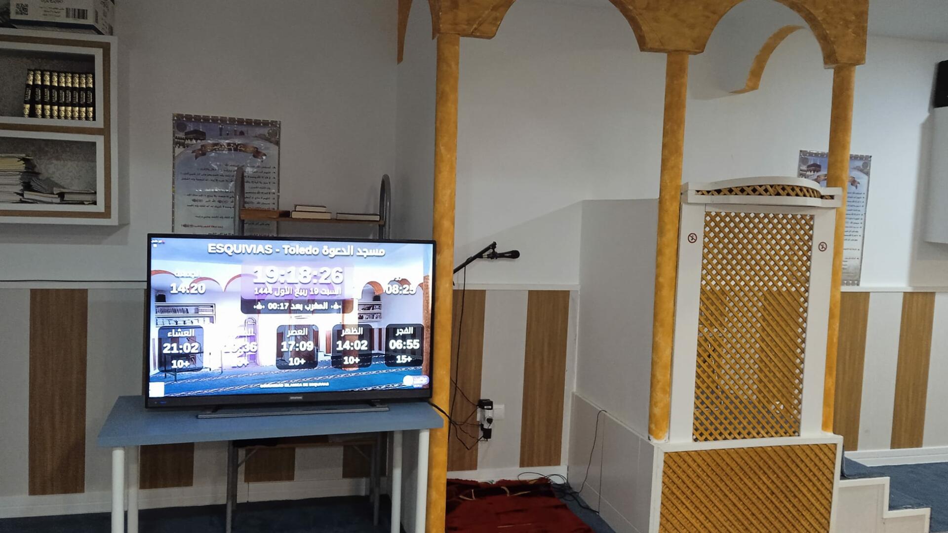 Between the athan and the iqama, and after each prayer, reminders and invocations are displayed. A Prophet's Hadith "May Allah's Prayer and Salvation Be to Him" is also displayed every 5 min