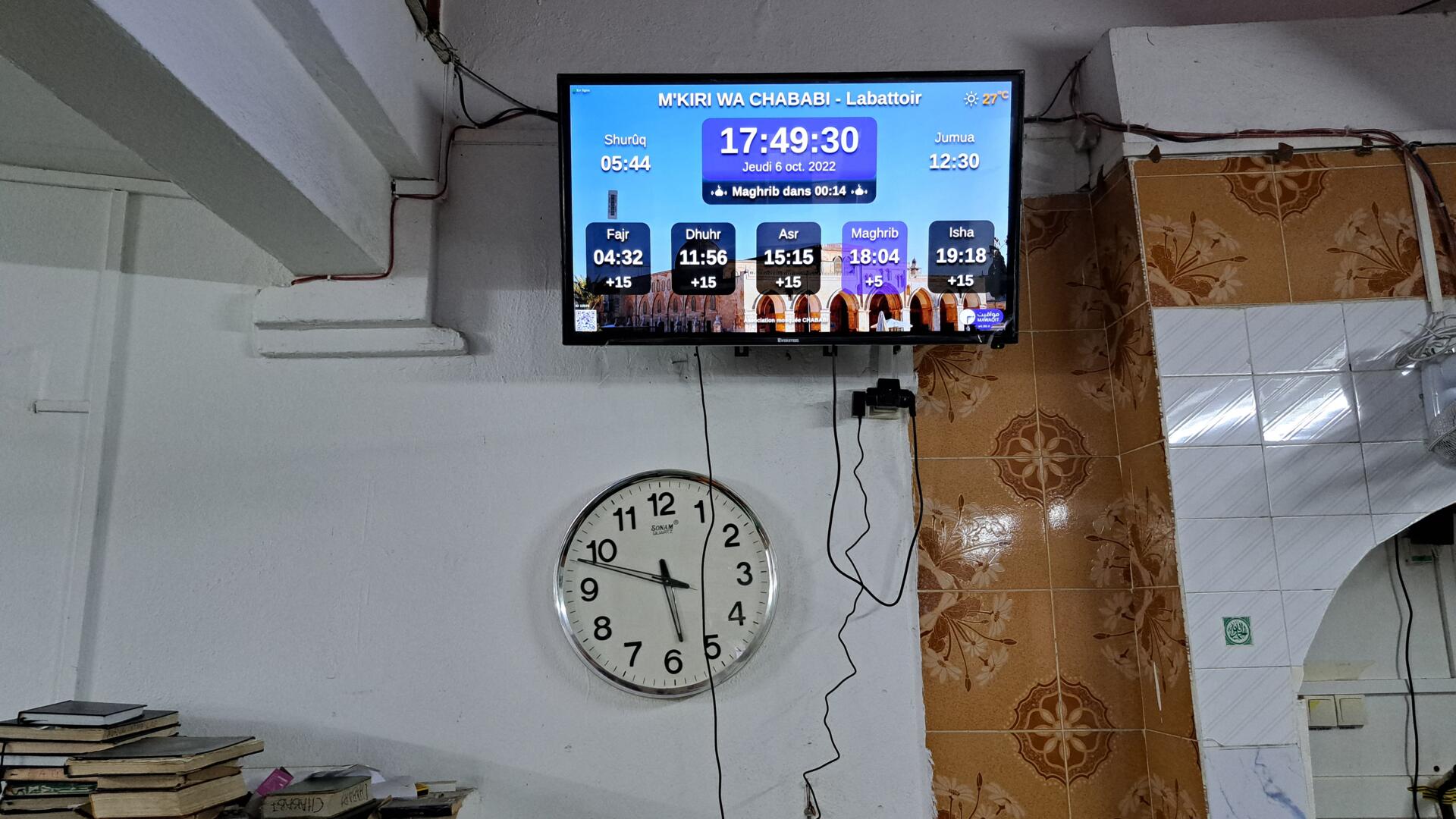 Between the athan and the iqama, and after each prayer, reminders and invocations are displayed. A Prophet's Hadith "May Allah's Prayer and Salvation Be to Him" is also displayed every 5 min