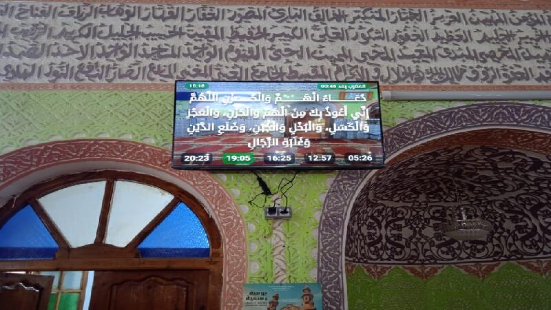 Between the athan and the iqama, and after each prayer, reminders and invocations are displayed. A Prophet's Hadith "May Allah's Prayer and Salvation Be to Him" is also displayed every 5 min