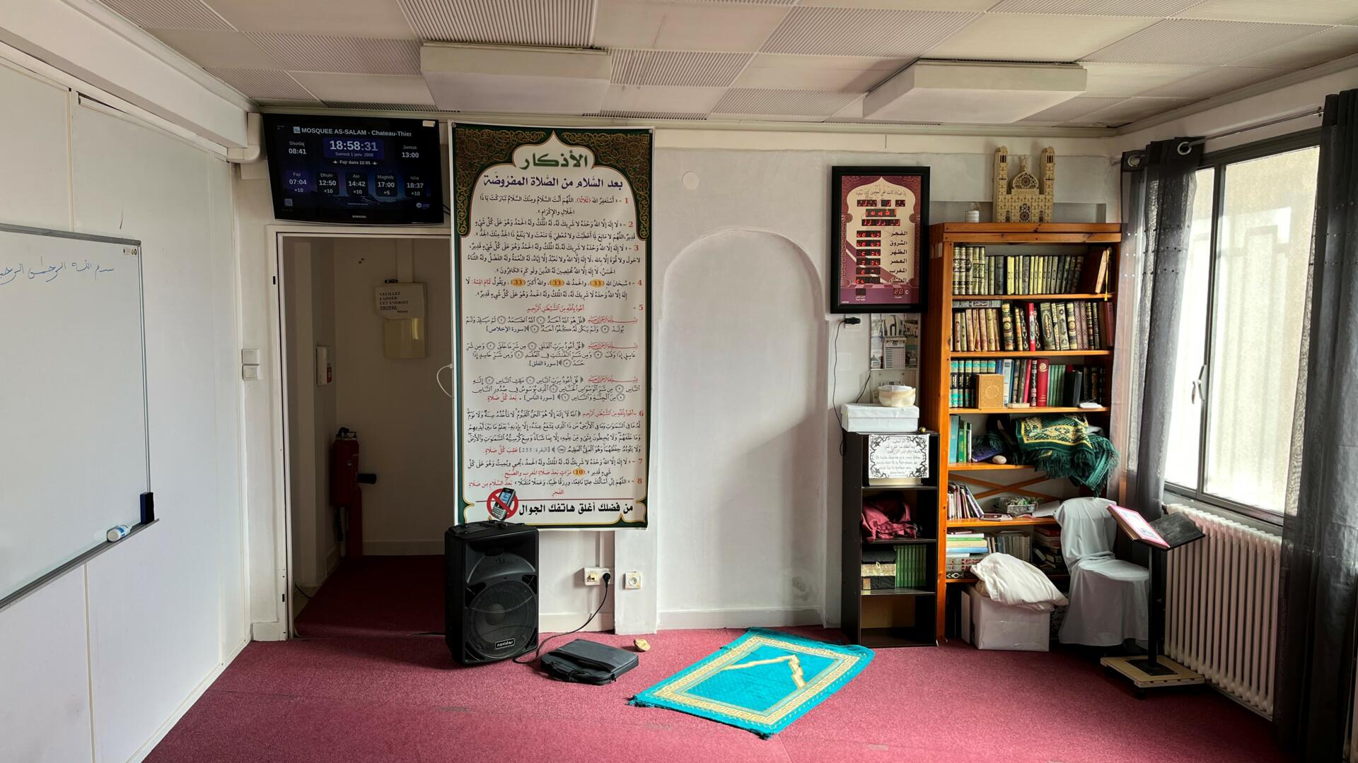 Between the athan and the iqama, and after each prayer, reminders and invocations are displayed. A Prophet's Hadith "May Allah's Prayer and Salvation Be to Him" is also displayed every 5 min