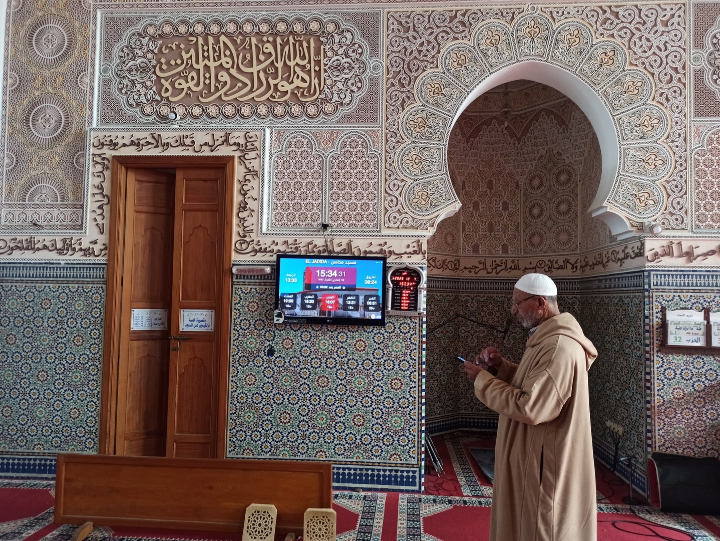 Between the athan and the iqama, and after each prayer, reminders and invocations are displayed. A Prophet's Hadith "May Allah's Prayer and Salvation Be to Him" is also displayed every 5 min