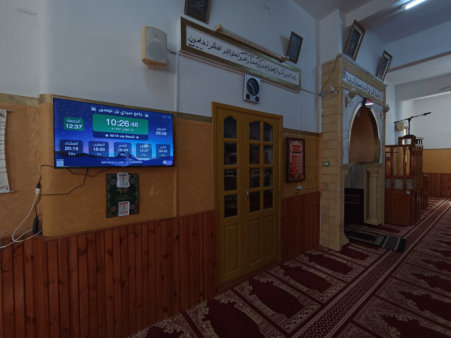 Between the athan and the iqama, and after each prayer, reminders and invocations are displayed. A Prophet's Hadith "May Allah's Prayer and Salvation Be to Him" is also displayed every 5 min