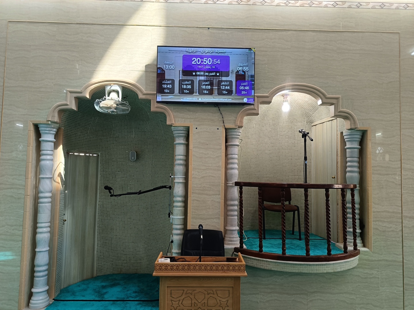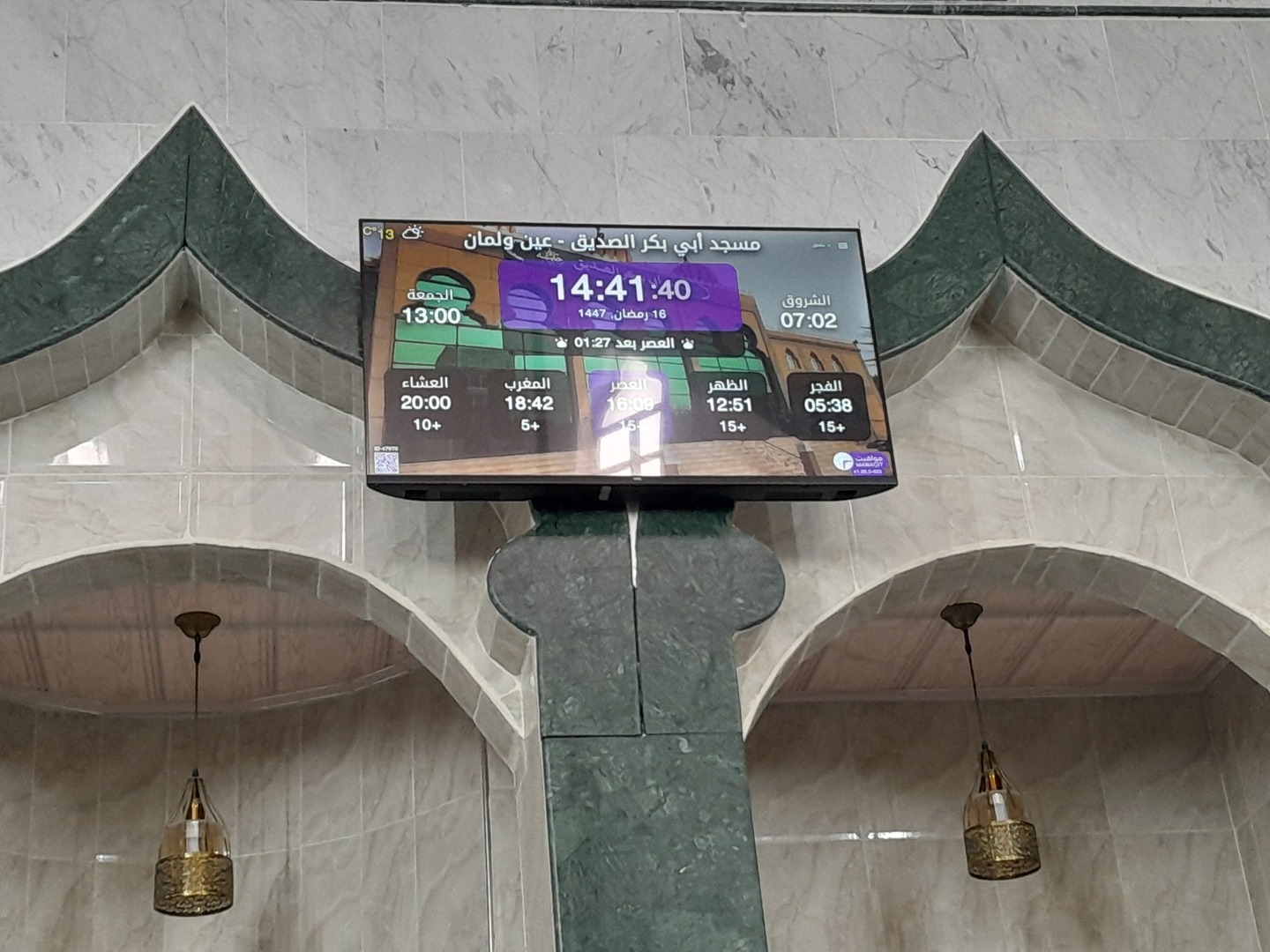 Between the athan and the iqama, and after each prayer, reminders and invocations are displayed. A Prophet's Hadith "May Allah's Prayer and Salvation Be to Him" is also displayed every 5 min