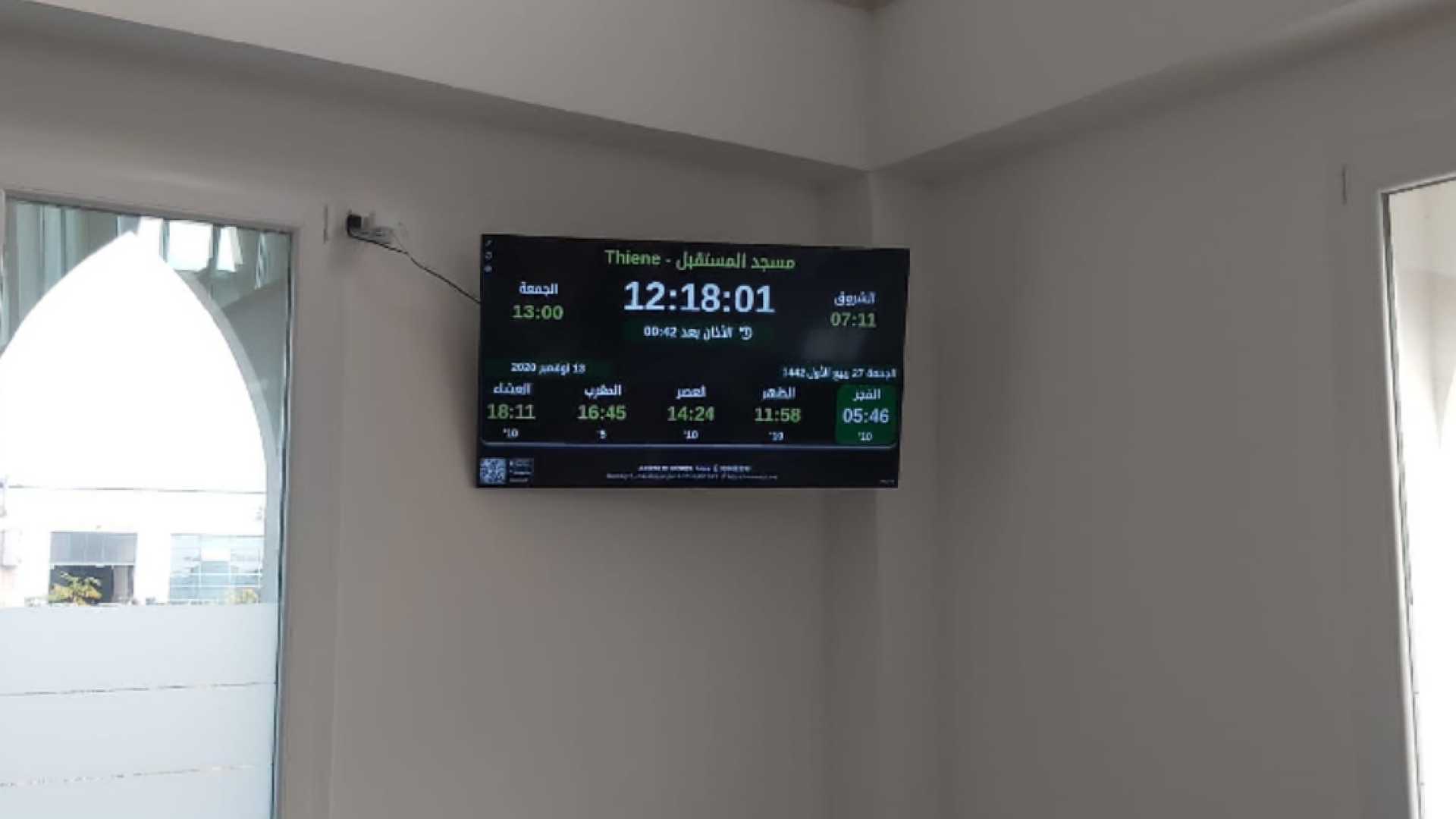 Between the athan and the iqama, and after each prayer, reminders and invocations are displayed. A Prophet's Hadith "May Allah's Prayer and Salvation Be to Him" is also displayed every 5 min