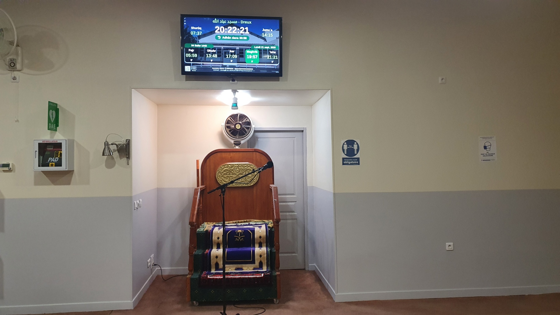 Between the athan and the iqama, and after each prayer, reminders and invocations are displayed. A Prophet's Hadith "May Allah's Prayer and Salvation Be to Him" is also displayed every 5 min