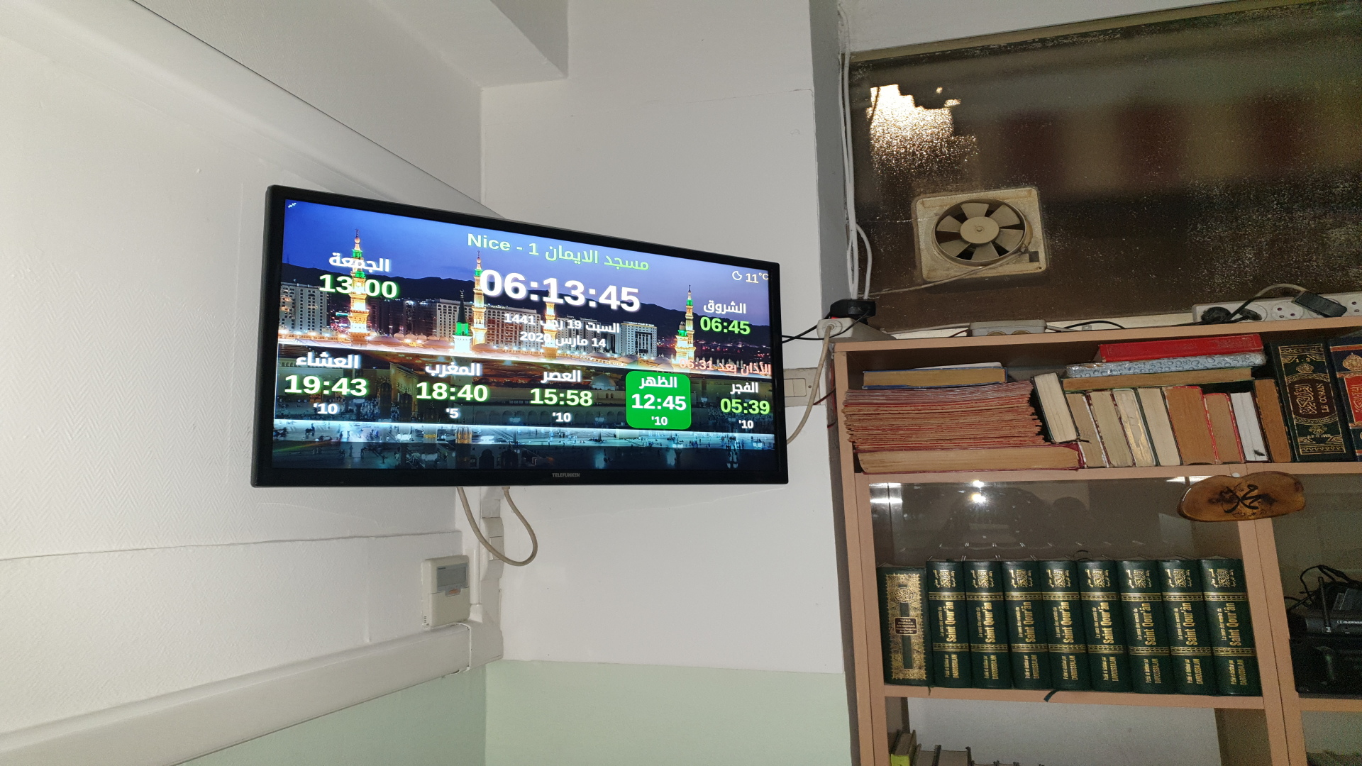 Between the athan and the iqama, and after each prayer, reminders and invocations are displayed. A Prophet's Hadith "May Allah's Prayer and Salvation Be to Him" is also displayed every 5 min