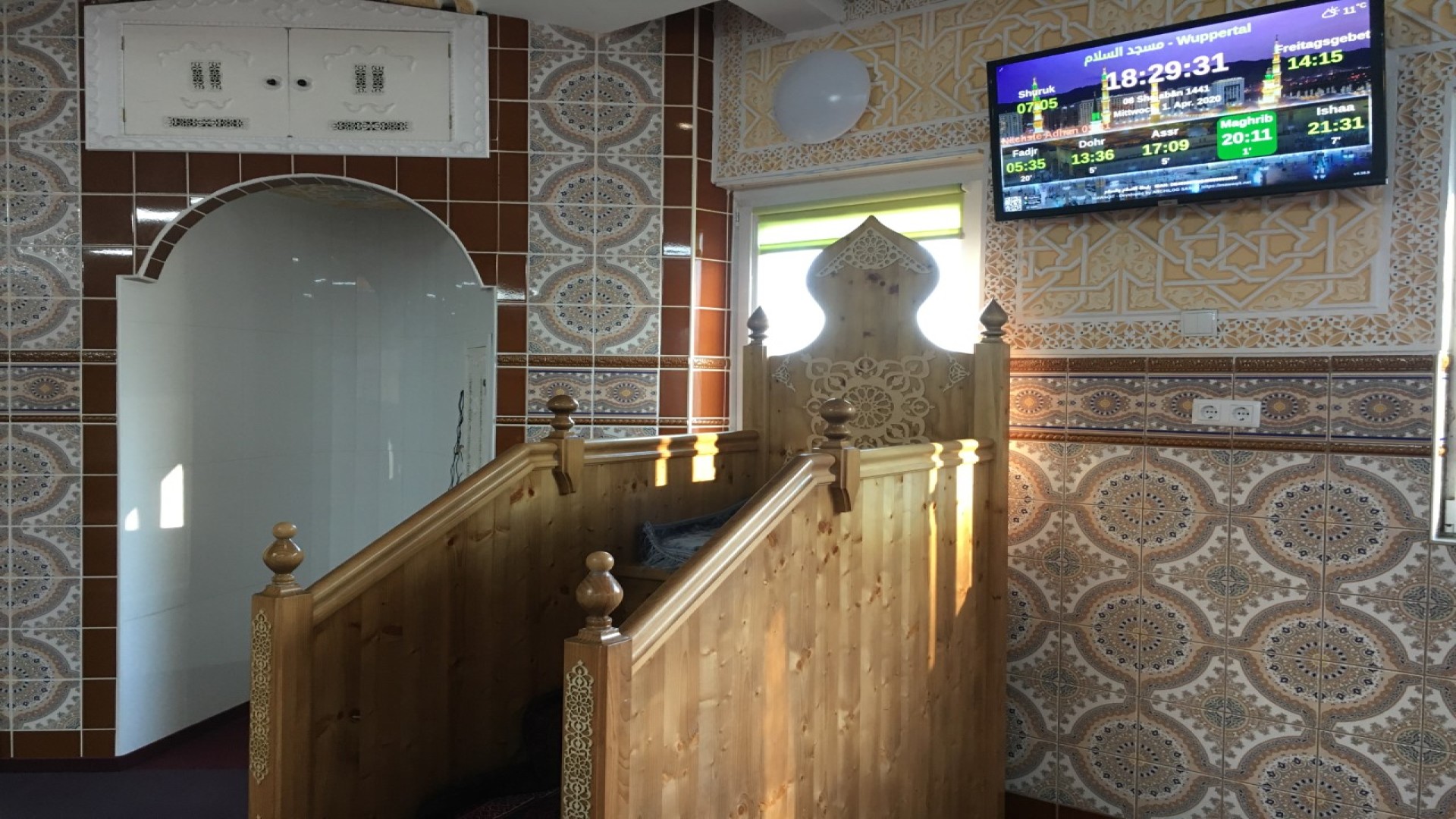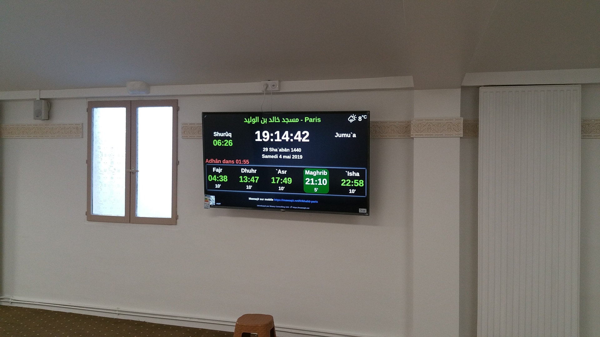Between the athan and the iqama, and after each prayer, reminders and invocations are displayed. A Prophet's Hadith "May Allah's Prayer and Salvation Be to Him" is also displayed every 5 min