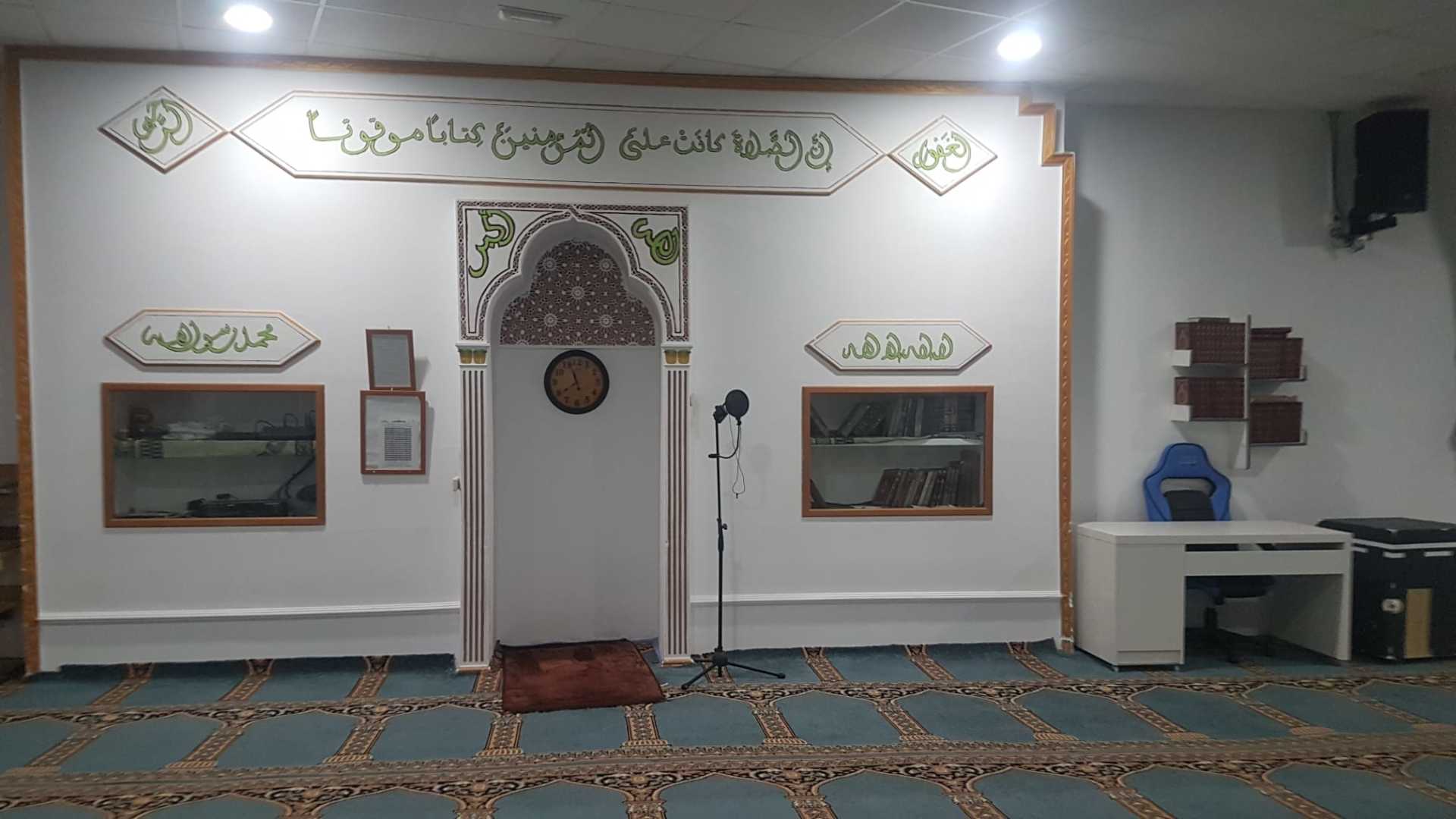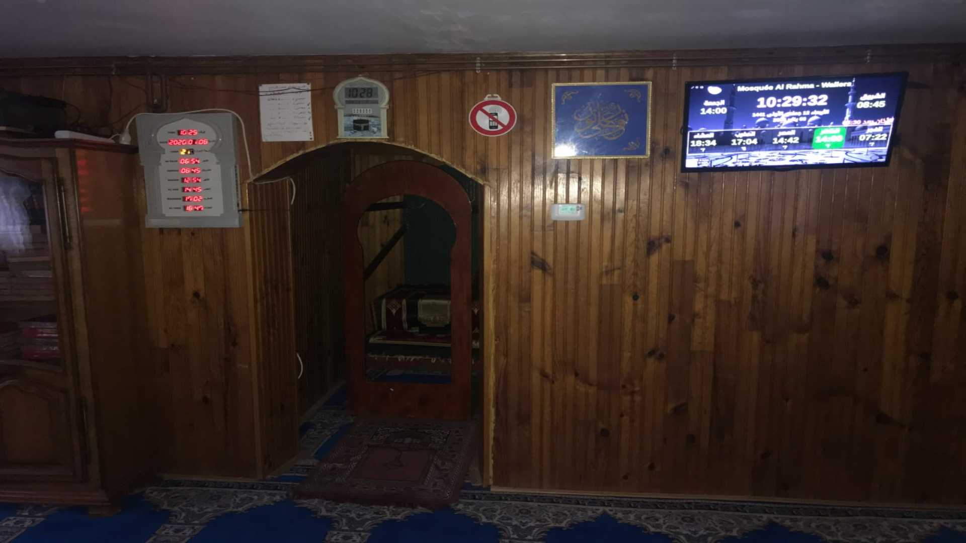 Between the athan and the iqama, and after each prayer, reminders and invocations are displayed. A Prophet's Hadith "May Allah's Prayer and Salvation Be to Him" is also displayed every 5 min