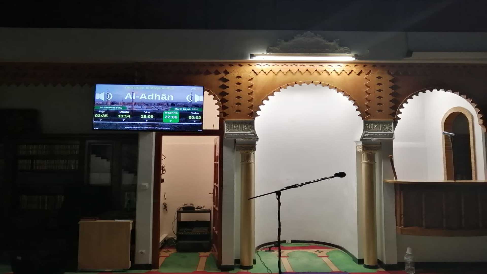 Between the athan and the iqama, and after each prayer, reminders and invocations are displayed. A Prophet's Hadith "May Allah's Prayer and Salvation Be to Him" is also displayed every 5 min