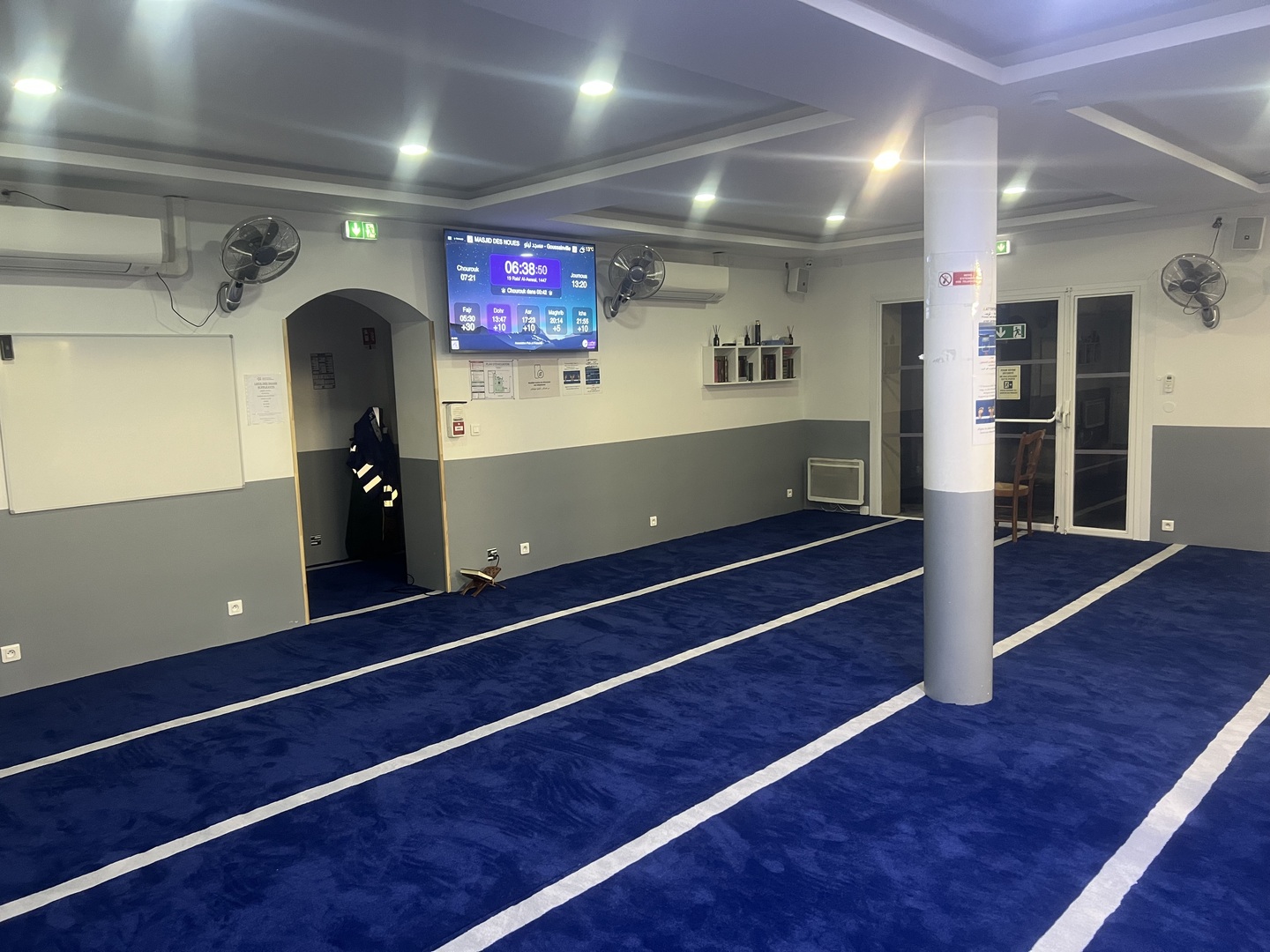 Between the athan and the iqama, and after each prayer, reminders and invocations are displayed. A Prophet's Hadith "May Allah's Prayer and Salvation Be to Him" is also displayed every 5 min