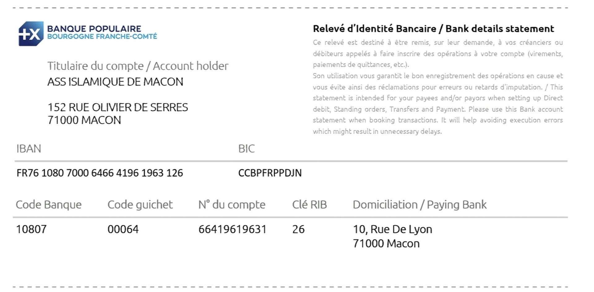 IBAN FR76 1080 7000 6466 4196 1963 126