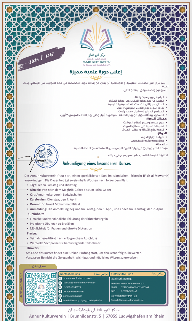 اعلان هام: إن شاء الله تعالى نبدأ دورة فقه المواريث يومي السبت والثلاثاء بين المغرب والعشاء مع فضيلة الشيخ د. اسماعيل رفعت بدايةً من يوم الثلاثاء 07 أفريل 2026