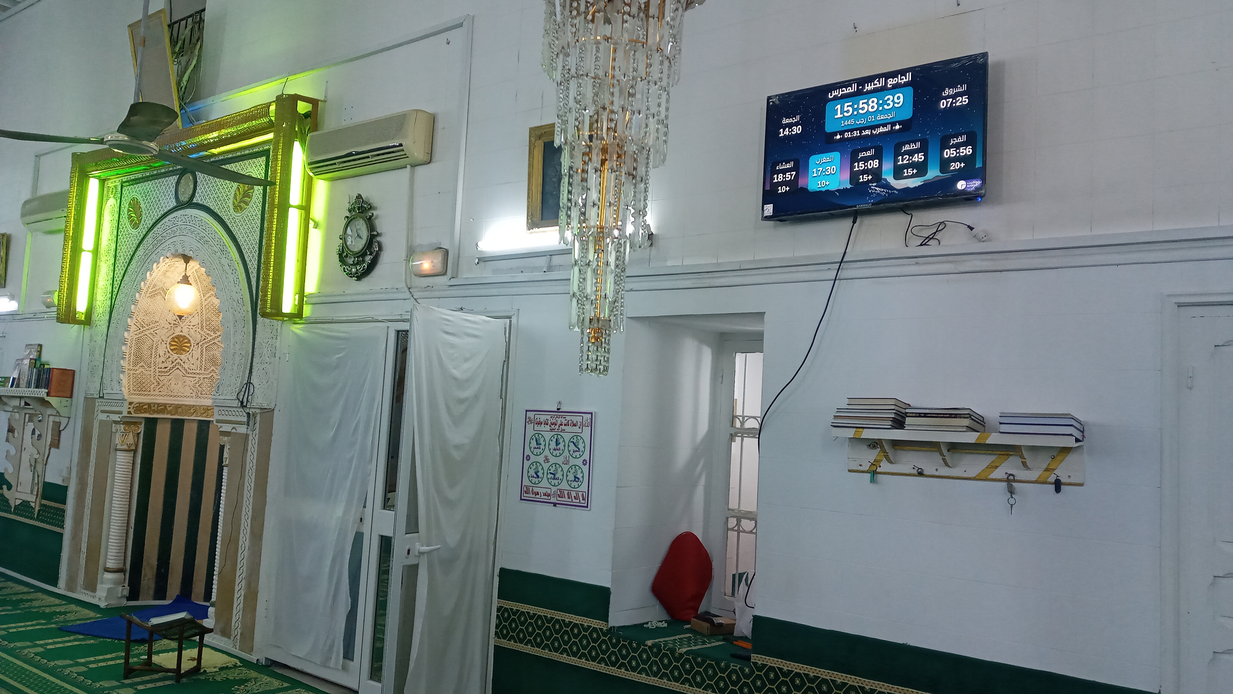 Between the athan and the iqama, and after each prayer, reminders and invocations are displayed. A Prophet's Hadith "May Allah's Prayer and Salvation Be to Him" is also displayed every 5 min